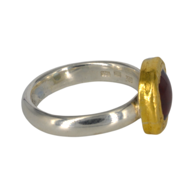 Deze ring met een kussenvormige cabochon granaat is gemaakt van zilver en van goud. De steen is gezet in 24 karaat goud en de scheen is van halfrond zilver en 4 mm dik.