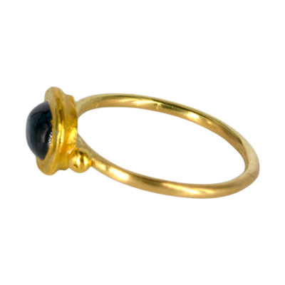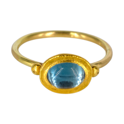 Deze ring is gemaakt van een London blue topaas. De steen is ovaal, cabochon geslepen en gezet in 24 krt goud. Naast de steen zijn 2 gouden balletjes geplaatst. De scheen is van18 krt goud en 1,5 mm dik.