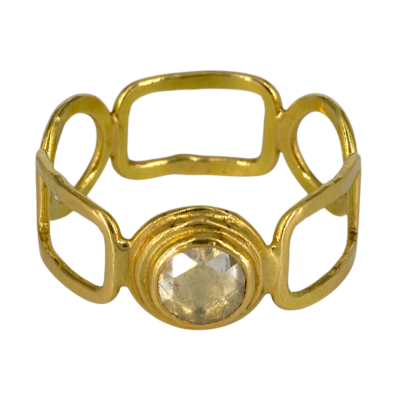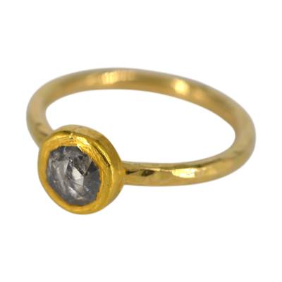 Deze ring is gemaakt met een grijswitte diamant. De diamant is roos geslepen en is 0,9 crt, de steen is gezet in 24 krt goud. De scheen van de ring is gemaakt van 18 karaat geplaneerd goud, de scheen is 2 mm dik.