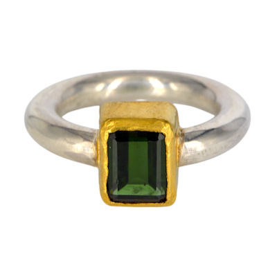 Deze ring is gemaakt met een mooie groene toermalijn, die baguette (rechthoekig) geslepen is. De steen is gezet in 24 karaat goud. De scheen is van zilver en 4 mm dik.