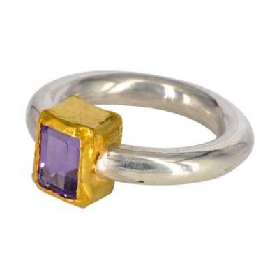 Deze ring is gemaakt met een paarse amethist, die baguette (rechthoekig) geslepen is. De steen is gezet in 24 karaat goud. De scheen is van zilver en 4 mm dik.