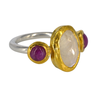 Deze ring heeft in het midden een ovale gefacetteerde maansteen, de twee ronde steentjes aan de zijkant zijn robijnen. De stenen zijn gezet in 24 krt goud en de scheen is gemaakt van 2,5 mm dik glad zilver.