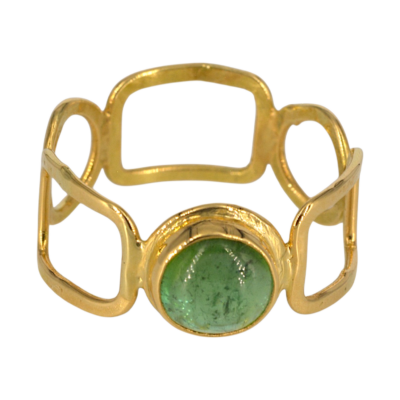 Deze ring met een groene ronde toermalijn is gemaakt van 18 karaat geelgoud. De scheen heeft de unieke vorm van rechthoeken en rondjes.