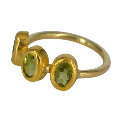 Deze ring is gemaakt van drie ovale facet geslepen peridots. De stenen zijn gezet in 24 krt goud. De scheen is van18 krt goud en 2 mm dik.