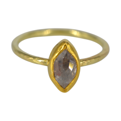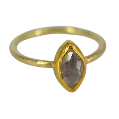 Deze ring is gemaakt met een grijswitte diamant. De diamant is marquise geslepen en is 1,2 crt, de steen is gezet in 24 krt goud. De scheen van de ring is gemaakt van 18 karaat geplaneerd goud, de scheen is 2 mm dik.