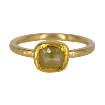 Deze ring is gemaakt met een gele diamant. De diamant is kussenvormig, facet geslepen en 1,15 crt, de steen is gezet in 24 krt goud. De scheen van de ring is gemaakt van 18 karaat geplaneerd goud, de scheen is 2 mm dik.
