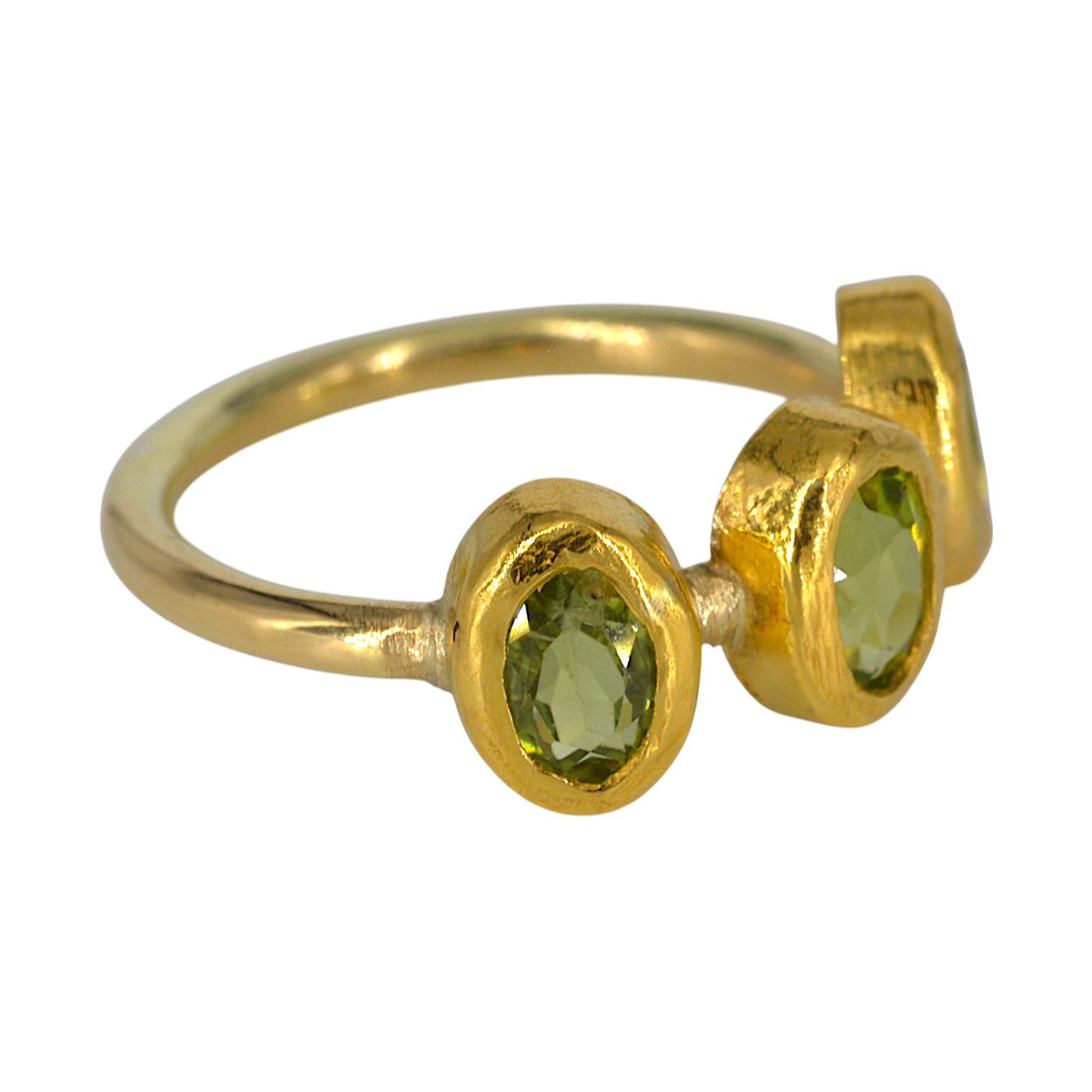Deze ring is gemaakt van drie ovale facet geslepen peridots. De stenen zijn gezet in 24 krt goud. De scheen is van18 krt goud en 2 mm dik.